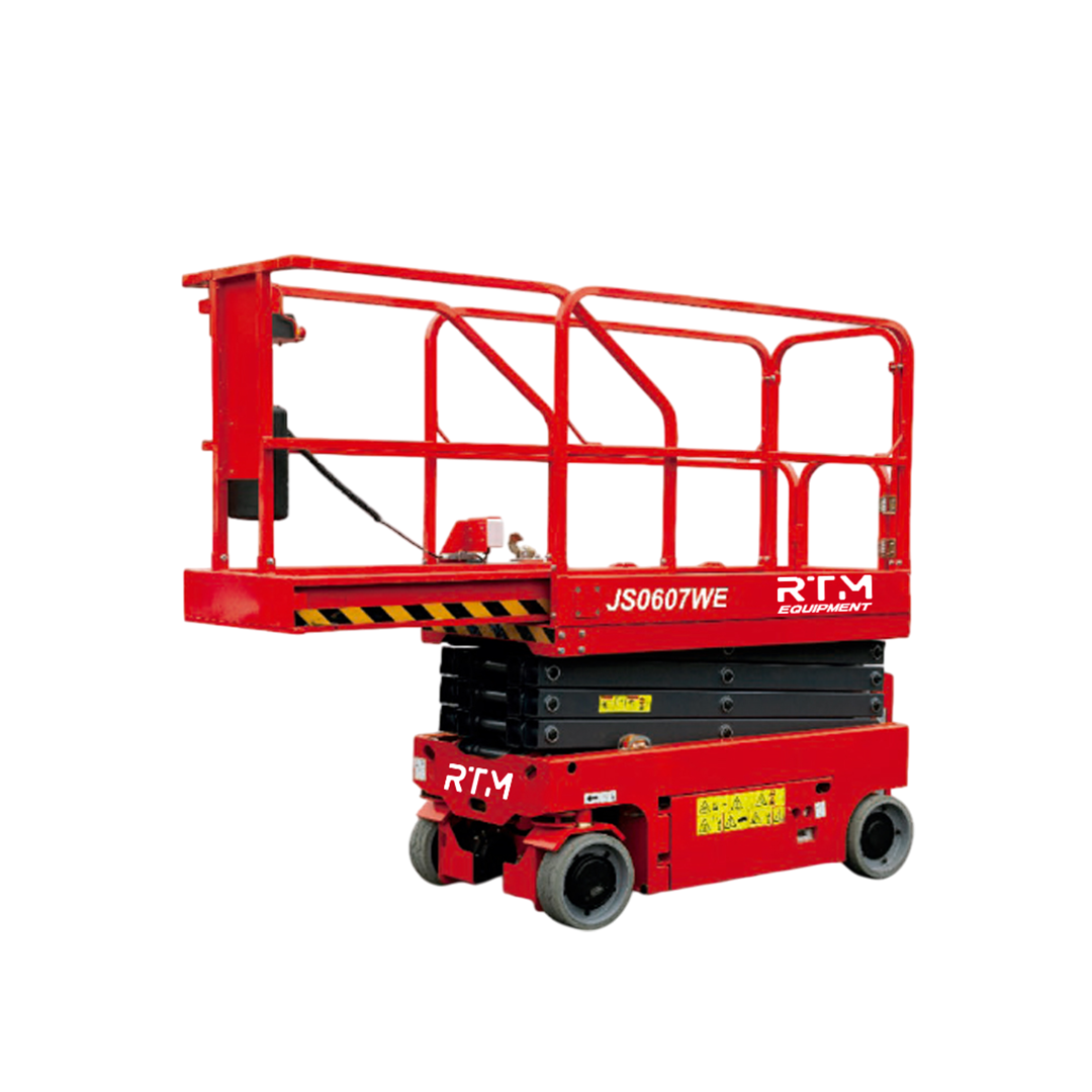 SABER MÁSAlcanza 7,8 m de altura de trabajo con la RTM JS0607WE. Esta plataforma eléctrica compacta soporta 230 kg y cuenta con una extensión de plataforma de 0,9 m, siendo ideal para mantenimiento en pasillos estrechos y espacios confinados.